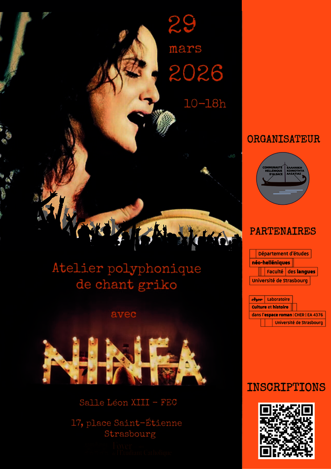 A l'issue de l'atelier les participants qui le souhaitent, pourront rester pour une restitution à 18h15 suivie d'une projection de documentaire (15') sur Ninfa Giannuzzi et un concert en collaboration avec la Représentation permanente de la Grèce auprès du Conseil de l'Europe.